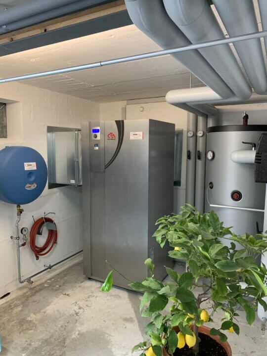 Familie Gross wollte von ihrer bestehenden Öl-Heizung wegkommen. Sie war auf der Suche nach einer erneuerbaren Heizung und einem Heizungspartner, welcher sie in ihrem Vorhaben unterstütze. Die baulichen Gegebenheiten passten ideal für eine innen-aufgestellte Wärmepumpe. Somit war keine Baueingabe notwendig und draussen im Garten musste kein Platz hergegeben werden. Es wurde ein neuer Technikraum definiert, welcher sich im alten Öl- Tankraum befindet. Auf Empfehlung der Firma Krieg Sanitär Heizung wurde der Wassererwärmer wieder am alten Standort, circa 12 m von der Wärmepumpe entfernt, installiert. Dadurch konnten lange Ausstosszeiten verhindert werden und zusätzliche Kosten für eine Zirkulationspumpe vermieden werden.